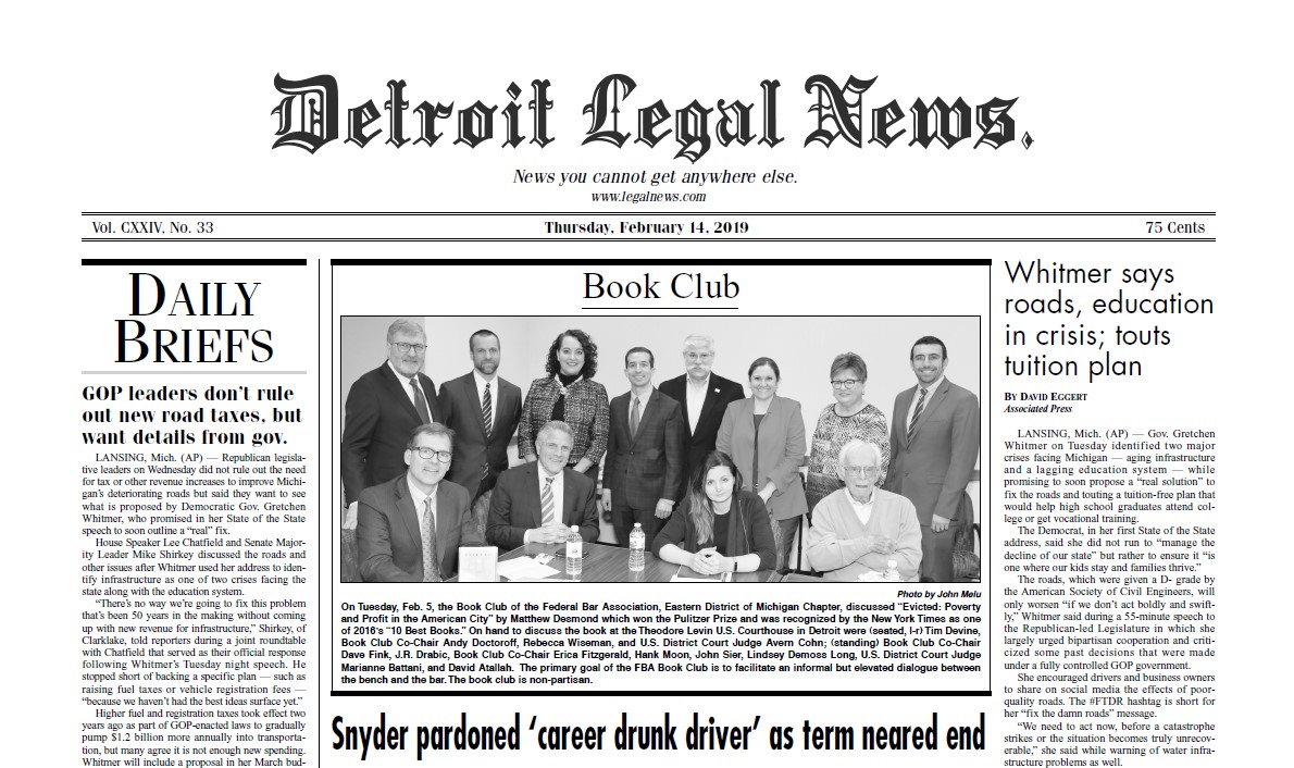 David H. Fink, the Co-Chair of the Book Club of the Federal Bar Association, Eastern District of Michigan Chapter, and Fink Bressack attorney Lindsay DeMoss Long, attended the February 5, 2019 meeting of the Book Club. The Club discussed Evicted: Poverty and Profit in the American City, by Matthew Desmond.